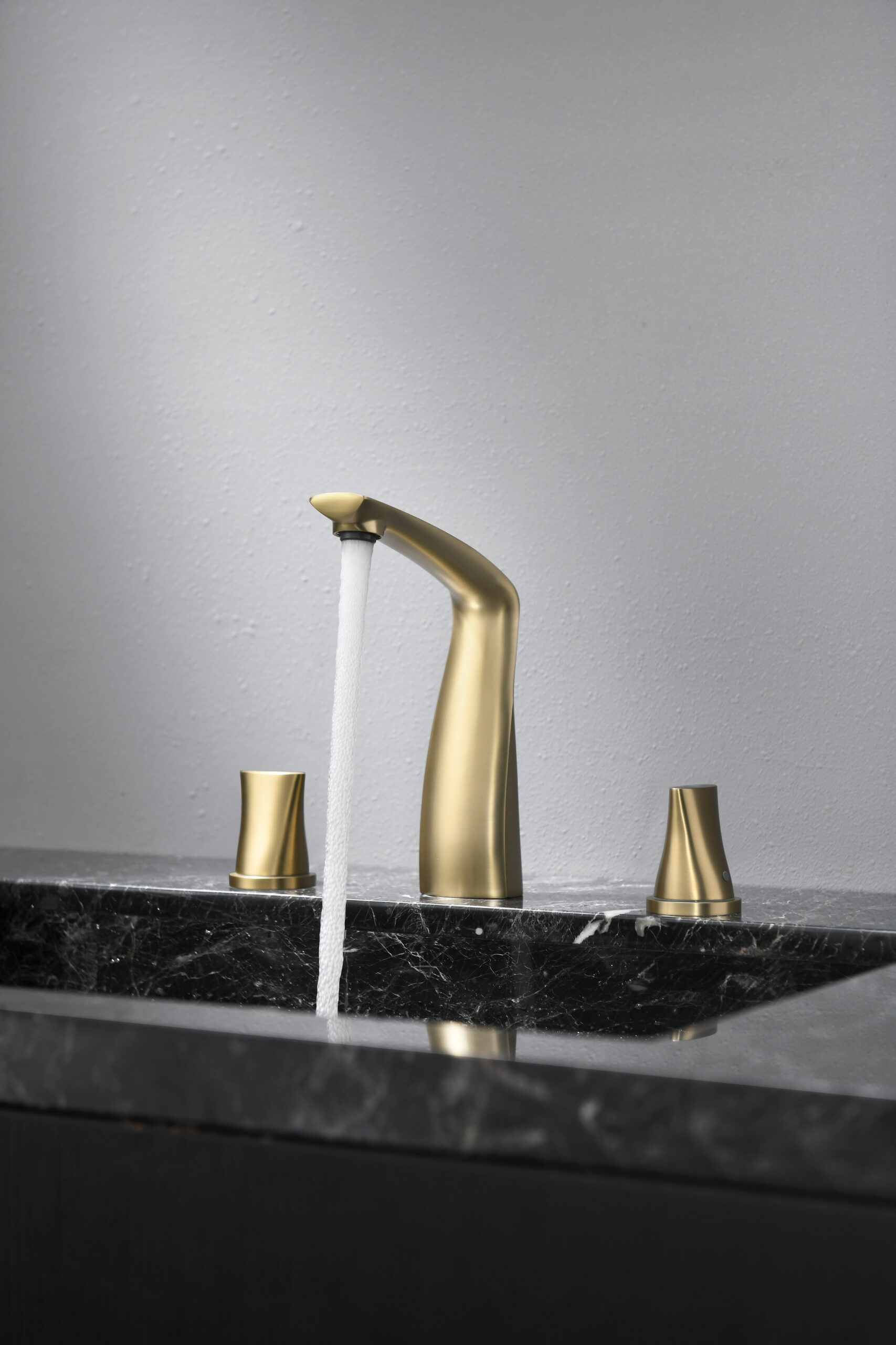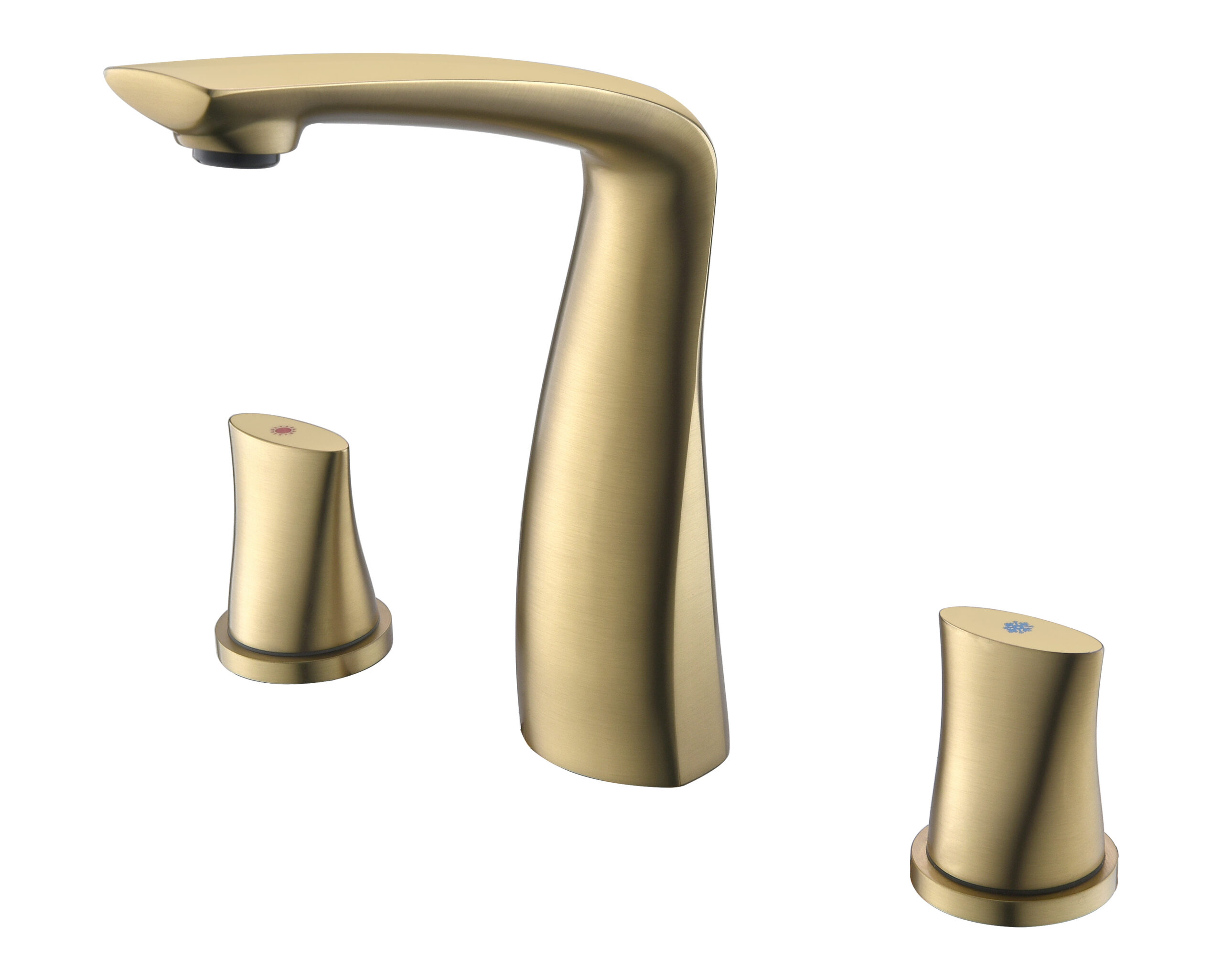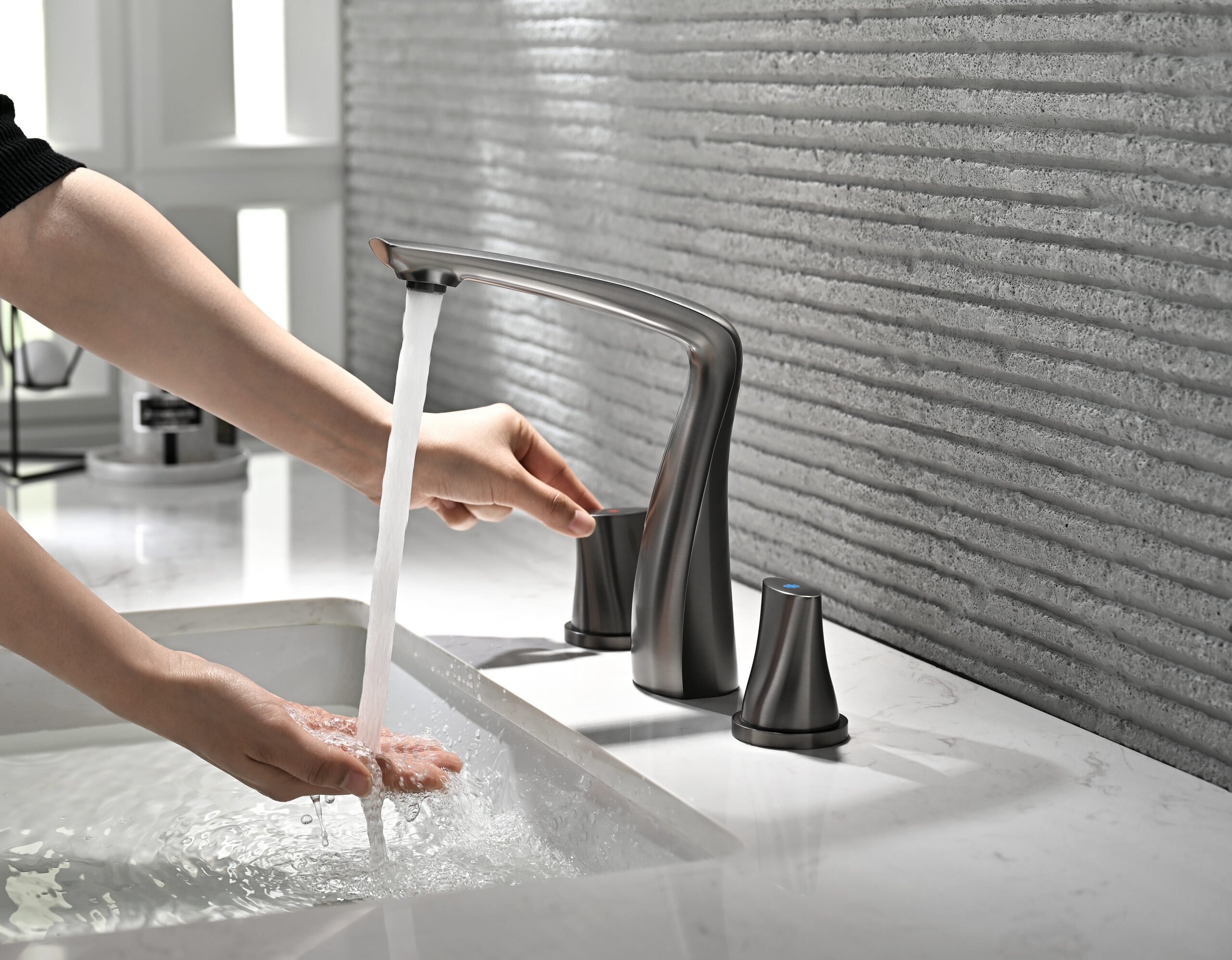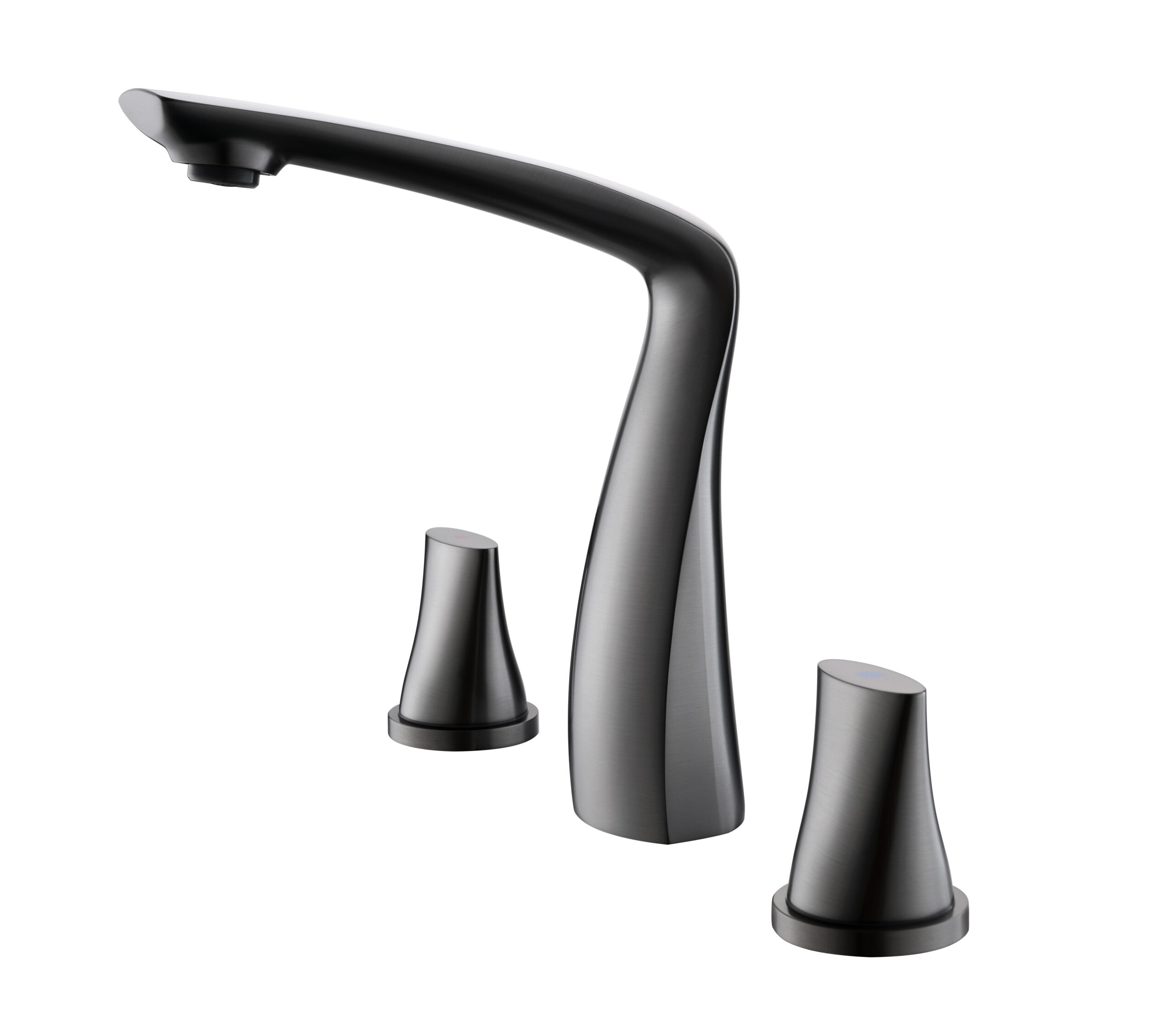 A modern basin faucet set featuring a sculpted, streamlined body and separately mounted handles for precise water control. With soft curves and a refined brushed finish, it adds a subtle luxury touch to premium bathrooms. Made entirely from solid brass, it combines elegant aesthetics with reliable durability for everyday use.