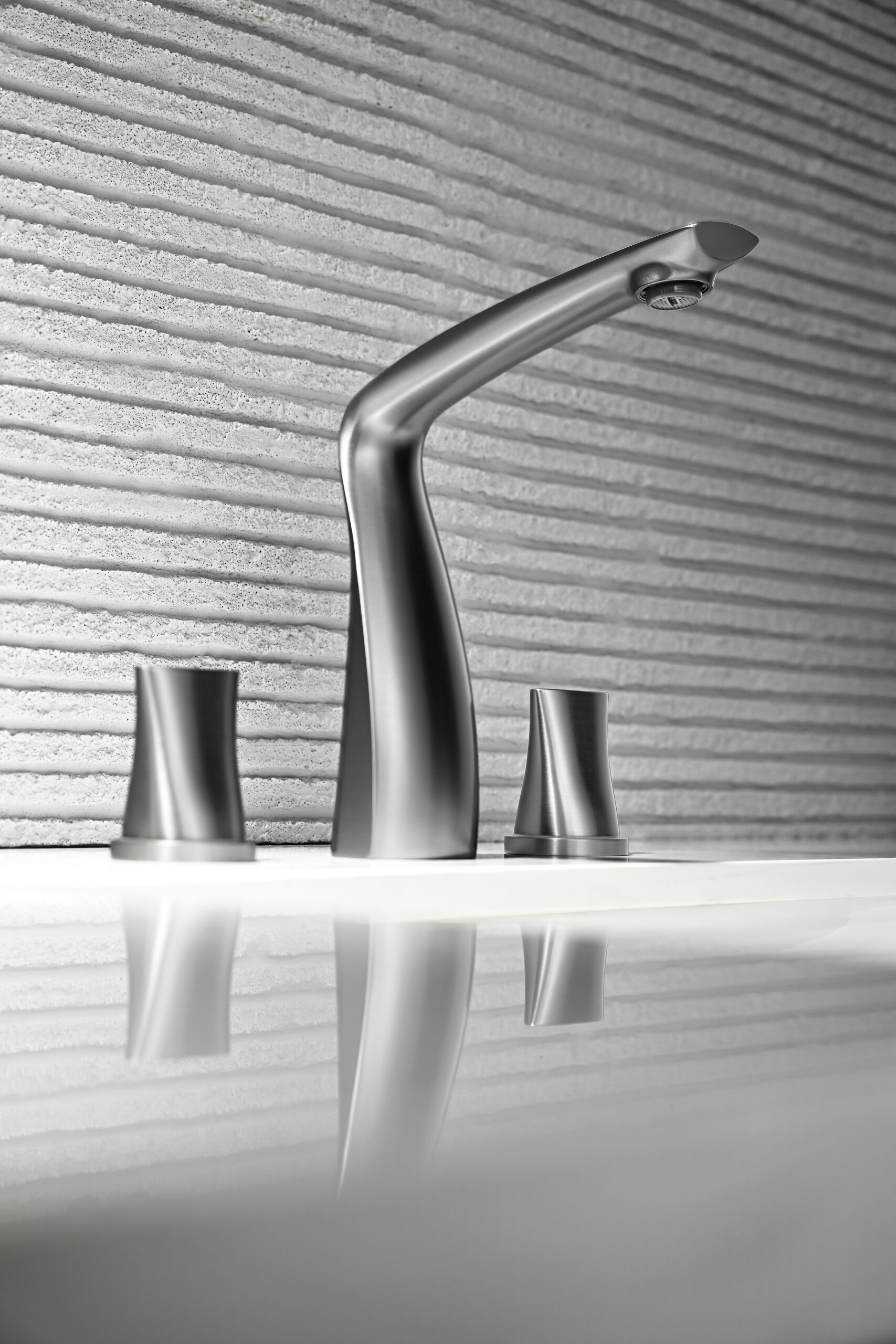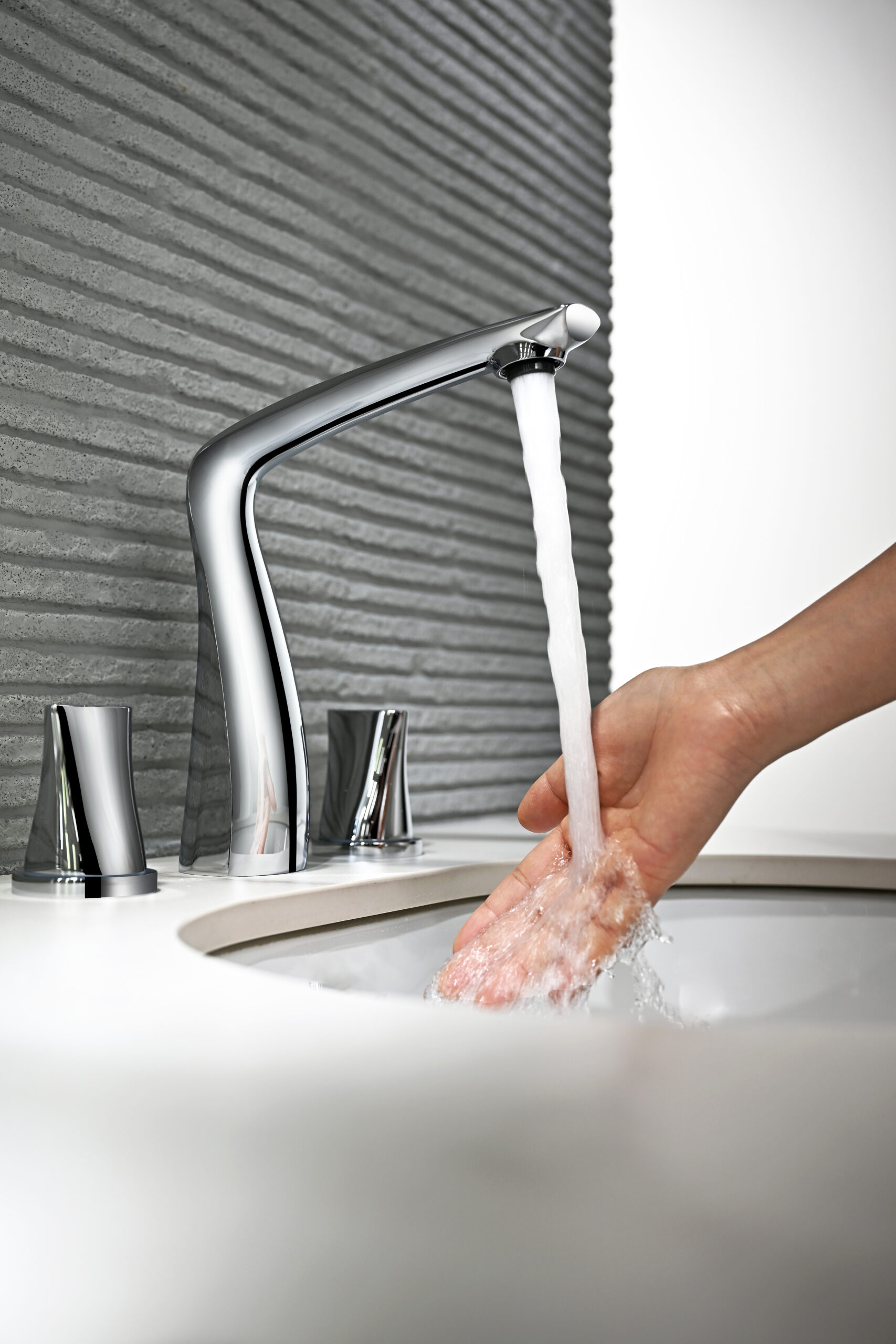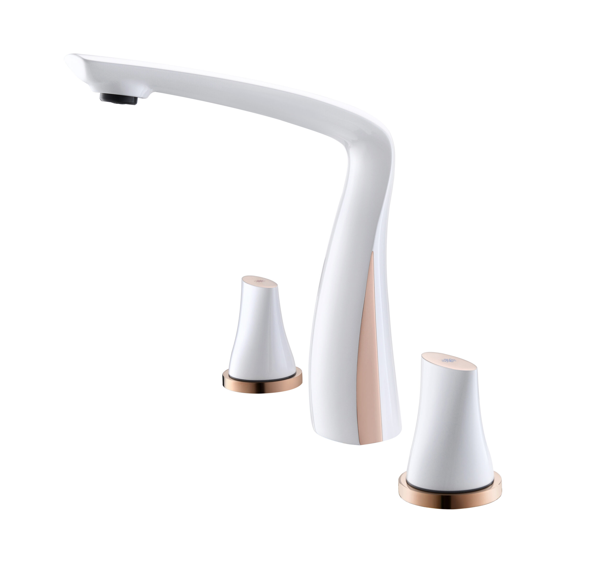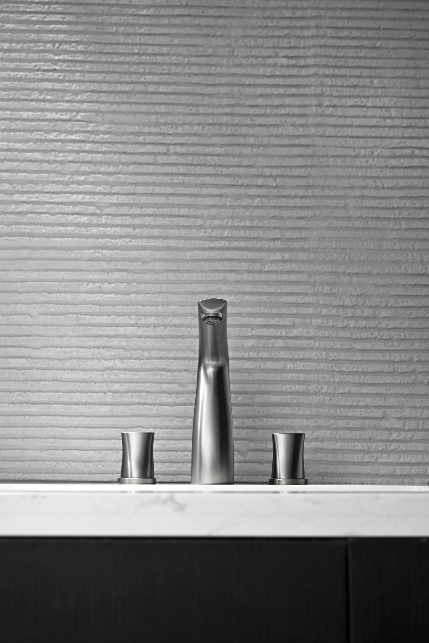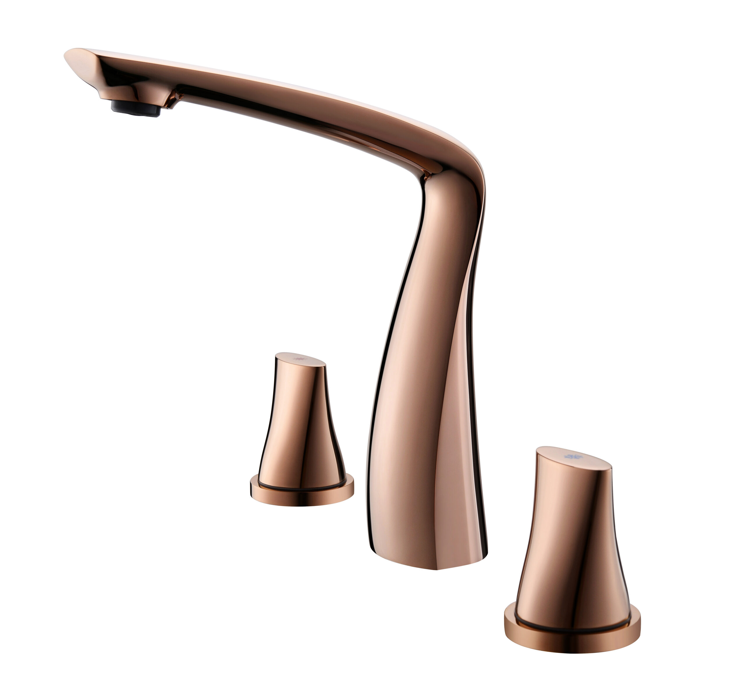 A modern basin faucet set featuring a sculpted, streamlined body and separately mounted handles for precise water control. With soft curves and a refined brushed finish, it adds a subtle luxury touch to premium bathrooms. Made entirely from solid brass, it combines elegant aesthetics with reliable durability for everyday use.