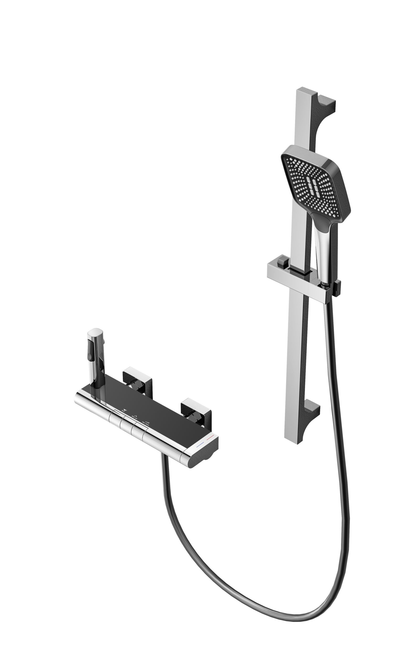This thermostatic shower faucet features a compact and minimalist layout without a slide bar, making it suitable for smaller bathrooms or bathtub areas. It provides two water outlets: a handheld shower and a lower faucet spout for rinsing or filling. The unit includes a digital temperature display that ensures safe and visible temperature control. A built-in storage platform allows easy access to shower products.