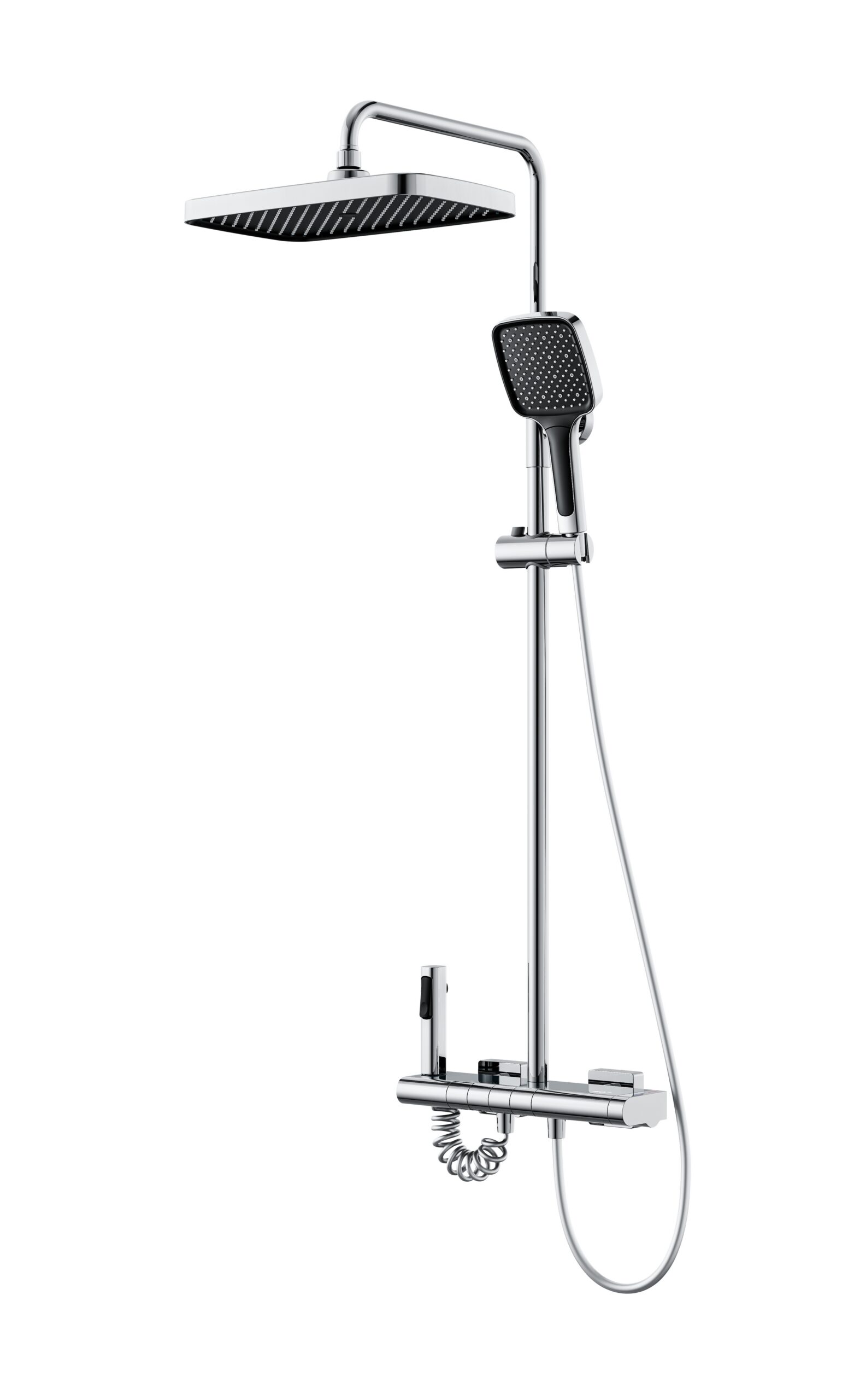 This thermostatic shower system combines a large rainfall showerhead, a handheld sprayer, and a visible digital temperature display for a safer and more enjoyable bathing experience. The thermostatic valve maintains stable water temperature, while the sleek wide control panel adds modern elegance and practical convenience. Crafted from solid brass with a premium chrome finish, it delivers durability, smooth control, and a luxurious shower feeling suitable for high-end bathrooms.