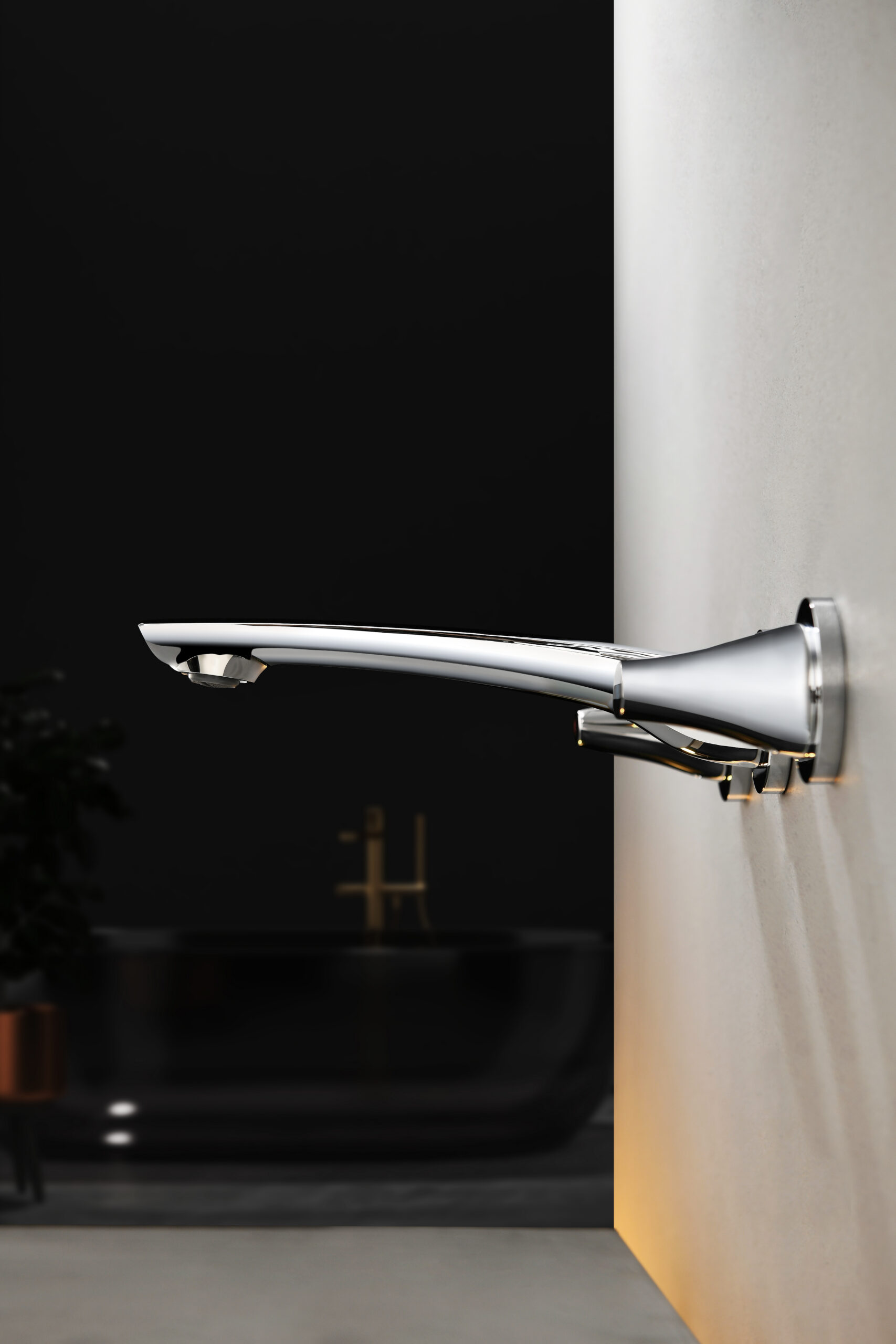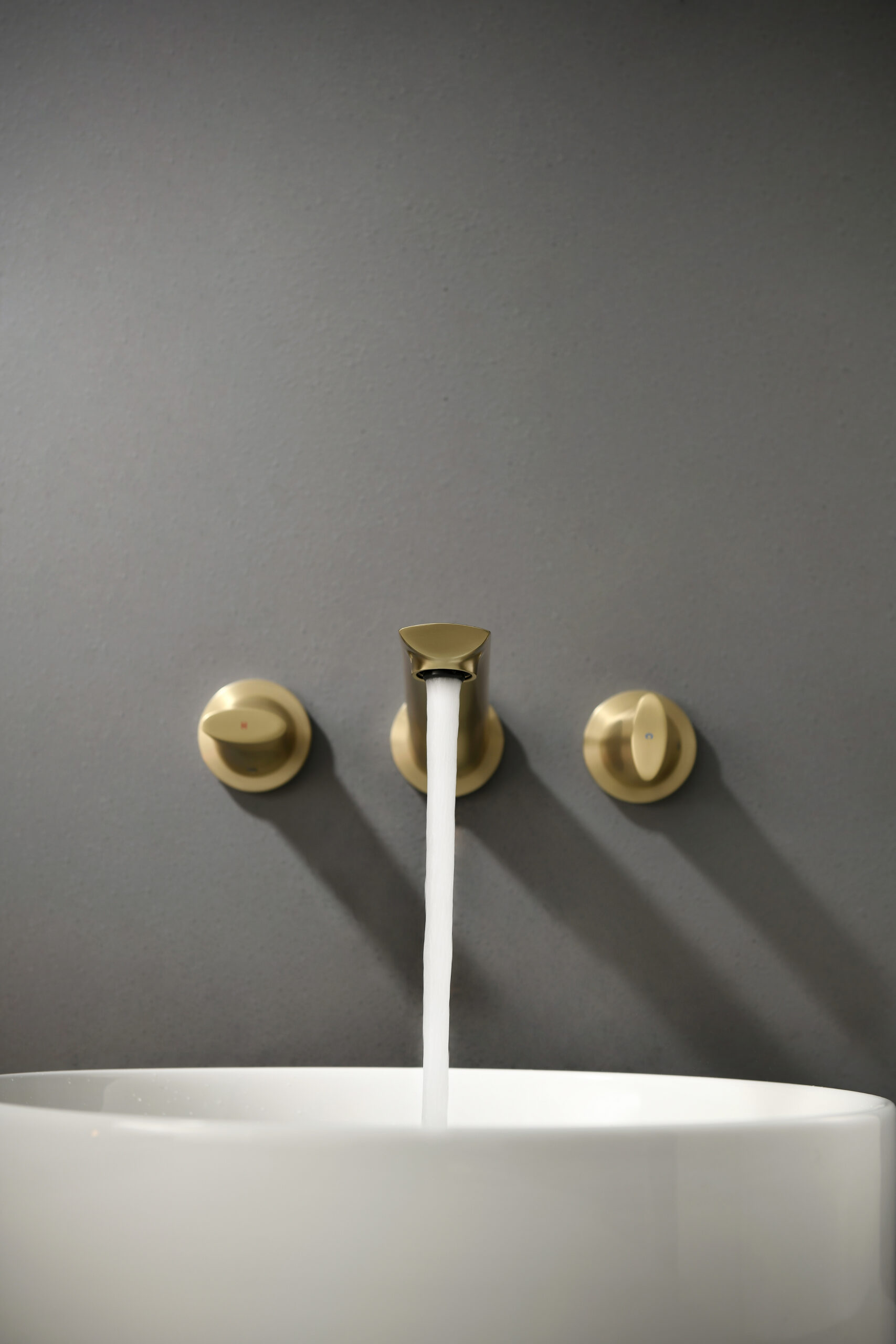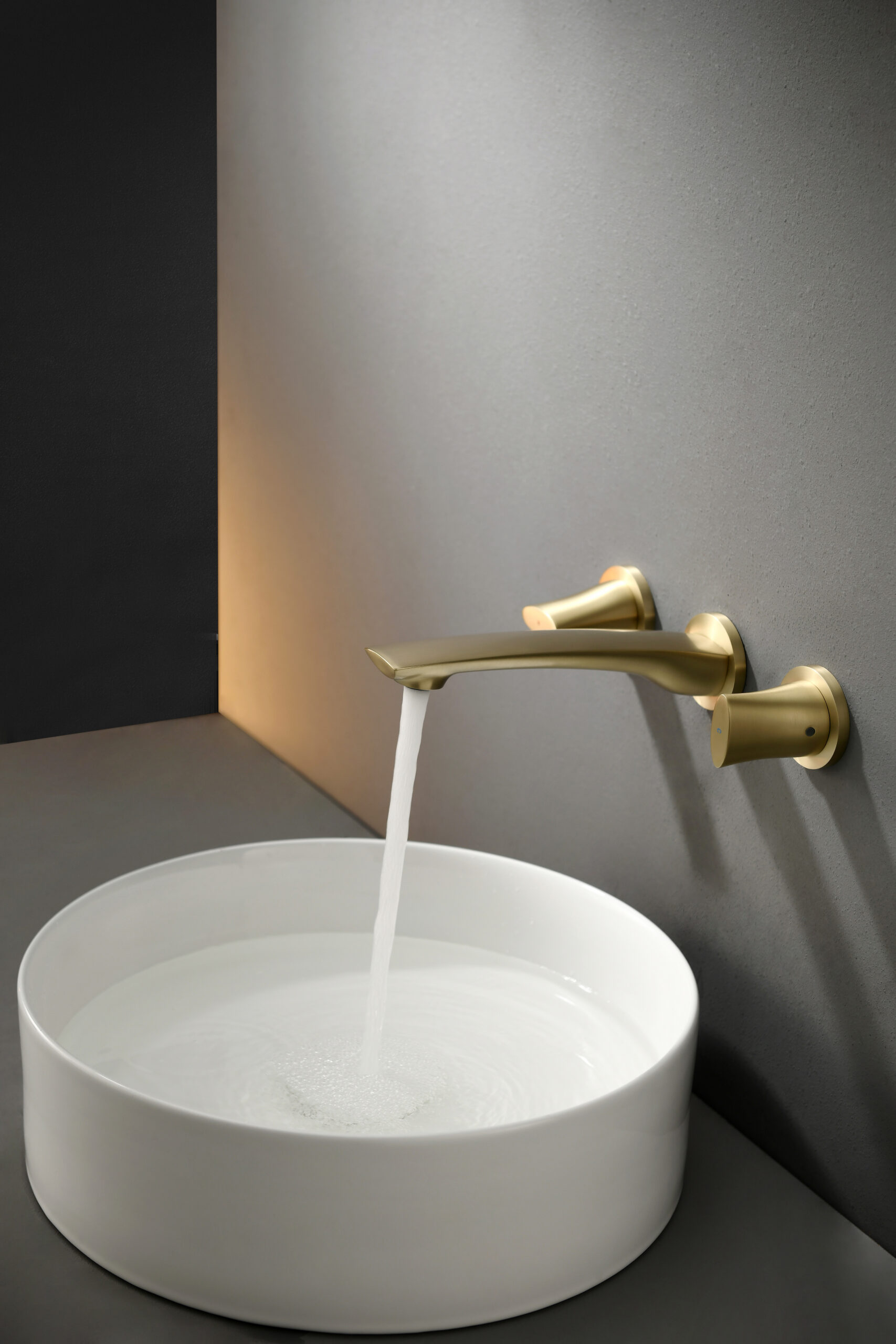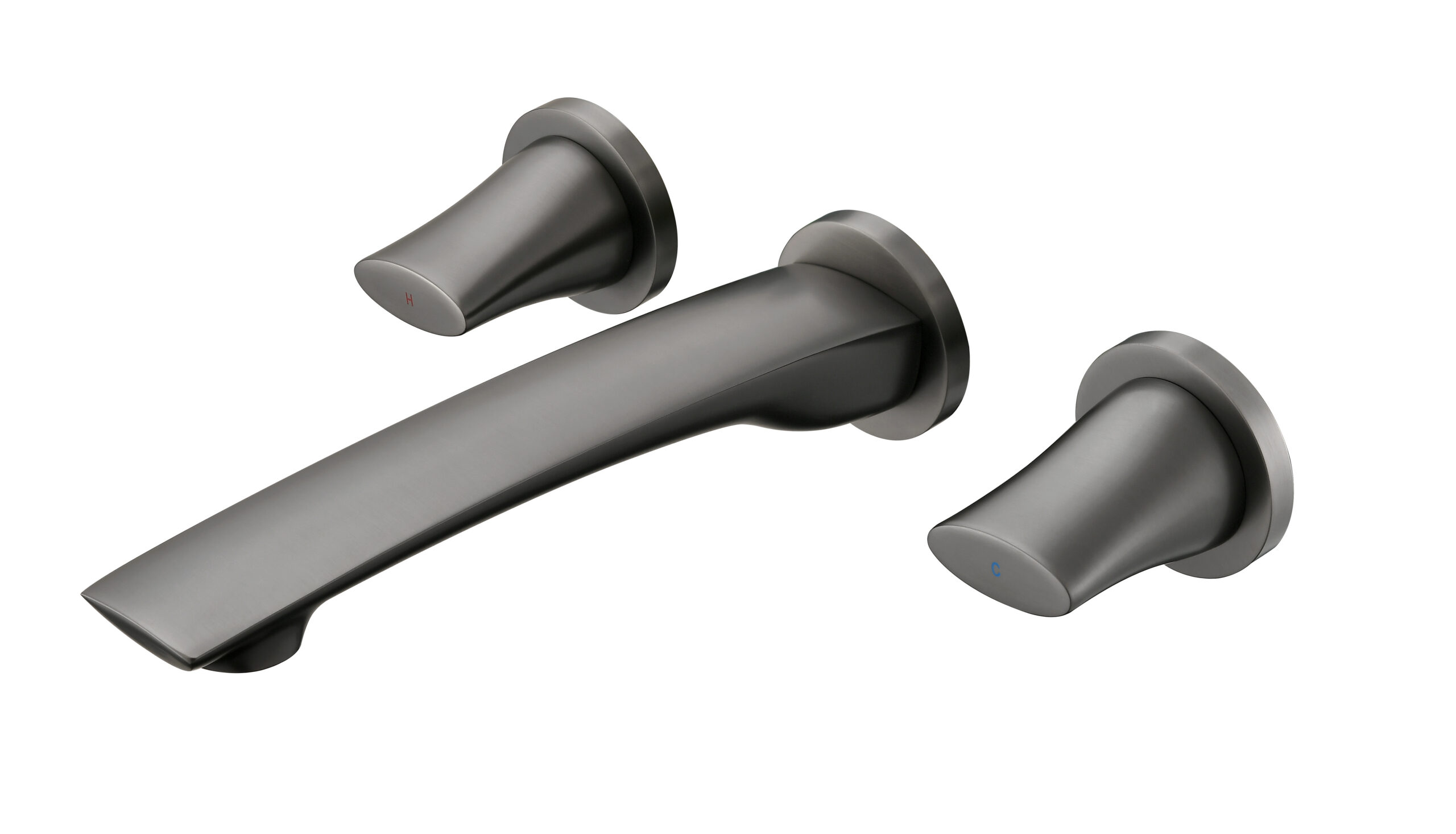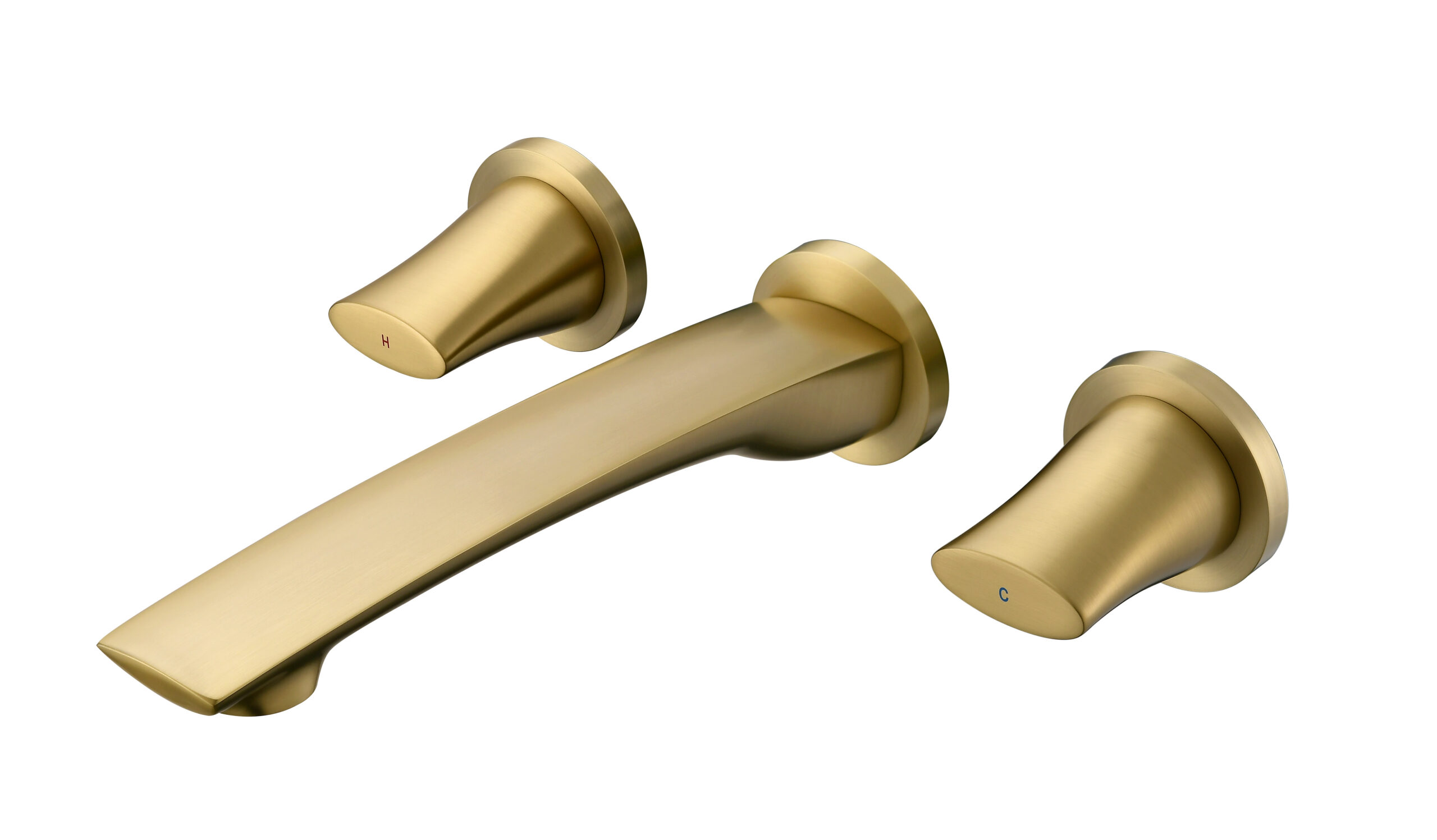A luxury wall-mounted lavatory faucet crafted from solid brass, offering smooth water flow and a sophisticated brushed finish. Its elegant two-handle control provides precise water adjustment and adds modern refinement to premium bathroom décor.